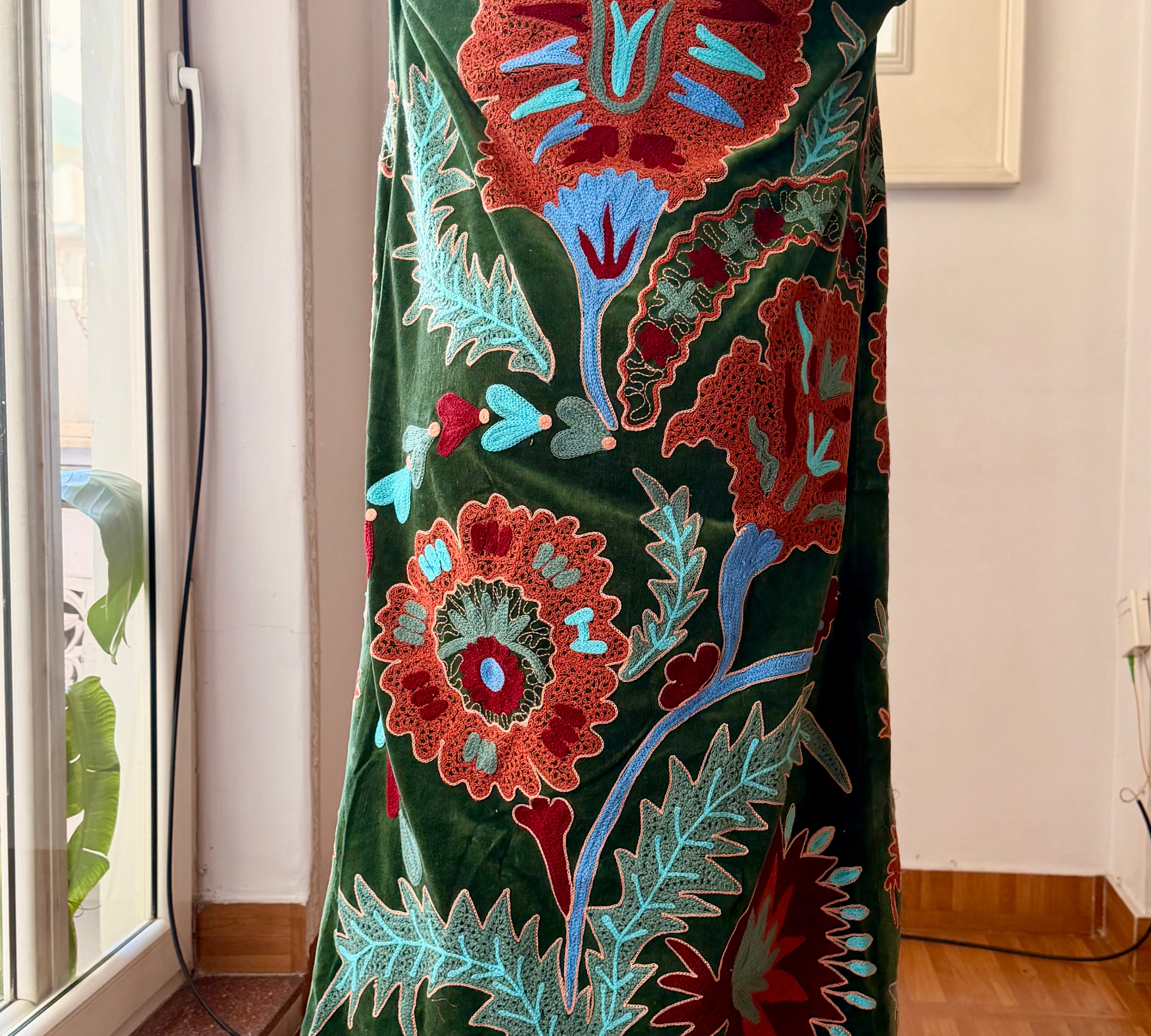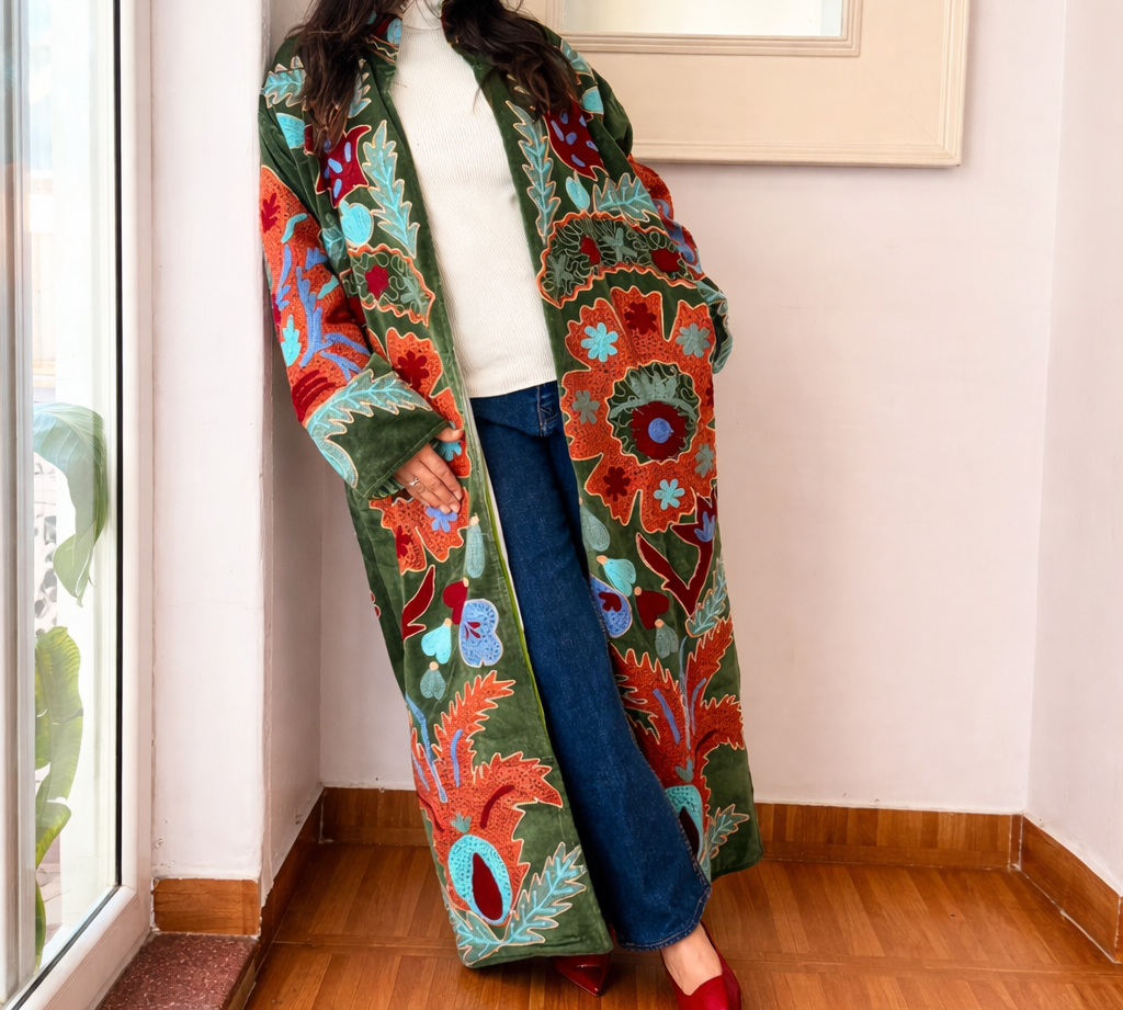 Velvet Embroidered Long Jacket – Green